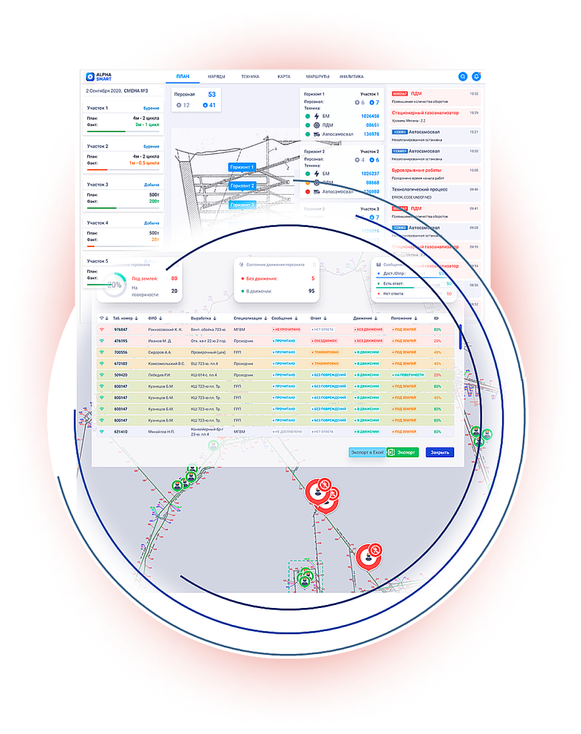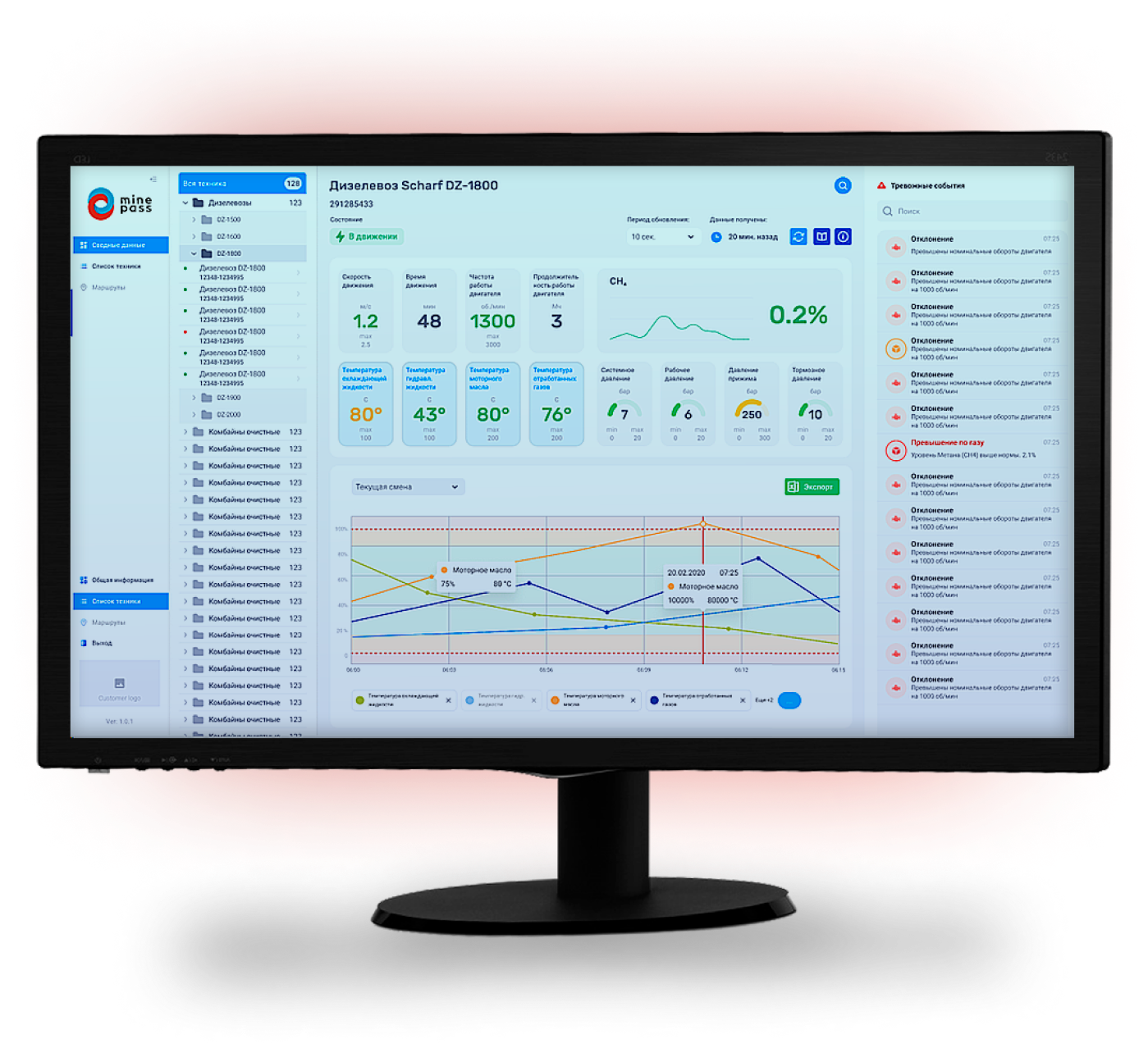 Provides reliable monitoring of more than twenty different atmospheric parameters, including gases (CO, CO2, CH4, etc.), temperature, humidity, and oxygen levels. Integration with the tracking system allows precise localization of dangerous air quality changes, instantly alerts about critical breaches of the safe levels, and helps prevent emergency situations.